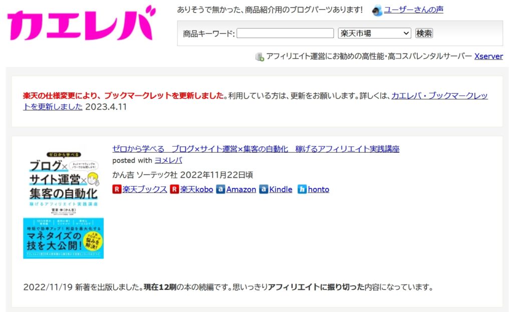 カエレバは、楽天・Amazon・Yahoo!などのリンクをボタン付きの見やすい形式で生成できるツールです。